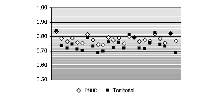 Finalmente, el indicador utilizado en el idh-pnud para medir la dimensión nivel de vida (pib per cápita), no se sometió a análisis de sensibilidad territorial por no contar con información estadística suficiente para su elaboración a escala desagregada, pero asimismo porque no se considera una medida válida para reflejar la capacidad que con él se pretende evaluar.[4]