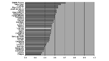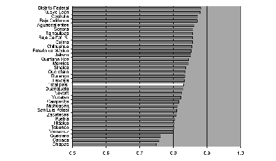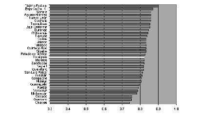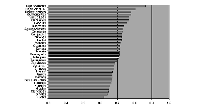 Un panorama marcadamente distinto se configura en países como Brasil y México que, según la clasificación del pnud, arrojan un nivel de desarrollo humano inferior al de Chile y Argentina. En las series de datos obtenidas, la desviación estándar de la tasa de alfabetización de adultos alcanzaba 8.6 en Brasil y 4.8 en México. En el primer caso, la medida indica la alta heterogeneidad con que se distribuye la alfabetización entre los estados. Para el año 2003 el indicador registraba un valor nacional de 88.4%, y valores extremos de 71.6 y 95%. En México, que presentaba en 2004 una tasa de alfabetización de 91.5%, los valores mínimo y máximo a nivel estadual fueron de 81.2 y 98.2 por ciento.