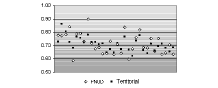 La homogeneización de las variables del idh-pnud, no sólo en términos desagregados sino incluso cuando se comparan los totales nacionales para diferentes países, ha sido señalada por autores como Kelley (1991) y Qizilbash (2002). La metodología propuesta por el pnud resulta más adecuada para discriminar la situación de los países que arrojan valores del idh bajos que la de aquéllos que presentan valores medios o altos.[2] Estas apreciaciones se ilustran por medio del análisis de variabilidad.[3]
