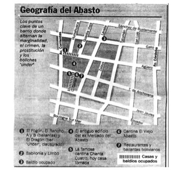 Son varios los artículos y relatos que publicaron diarios y revistas. Pero la forma de abordar el deterioro del barrio es siempre la misma: los “ocupantes” cometen por añadidura otras transgresiones a la ley, como el robo y la venta de drogas. Este desplazamiento de la ilegalidad también absorbe por inercia una tercera figura, la del inmigrante. Así, abandono, peligro, ocupante y peruano y boliviano fueron los significantes que vertebraron las representaciones sociales sobre el Bronx porteño. Otro informe periodístico muestra que estas estigmatizaciones alcanzan su máxima expresión en las dos áreas del barrio de peor reputación: la cortada Carlos Gardel y la calle Agüero, entre Guardia Vieja y la avenida Corrientes. A cada una de estas dos porciones del barrio le cabe una descripción,[18] ambas acompañadas por un mapa que muestra la ubicación de las casas y los baldíos ocupados, donde destaca asimismo la ocupación del Chanta Cuatro, la antigua casa de tango frecuentada por Carlos Gardel para interpretar sus canciones (figura 3). El resto de la información que ofrece este mapa, titulado “Geografía del Abasto”, repara en la actividad nocturna del barrio, especialmente la recreada por los bolivianos en los restaurantes y los locales para bailar.