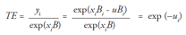 Donde Y*it es la producción, que es igual a Yit cuando la variable dependiente no está transformada e igual a exp(Yit) , cuando ésta se expresa en logaritmos. Por tanto, la eficiencia técnica se calcula como el cociente del nivel de producción obtenido respecto del máximo alcanzable, dadas las cantidades de los inputs (es decir, cuando uit = 0). Asimismo, su valor oscila entre 0 y 1, siendo éste último caso el más favorable.