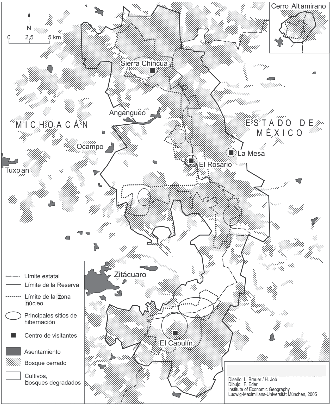 La rbmm (56,259 ha; zonas núcleo: 13,551 ha) fue declarada en 1986 y ampliada significativamente en 2000. Se encuentra en la región limítrofe del estado de Michoacán y del Estado de México (figura i)[4] y es mundialmente conocida porque es la principal zona de invernada de la mariposa monarca (Danaus plexippus), una especie que se caracteriza por su conducta migratoria notable, científicamente comprobada apenas a finales de la década de 1970. La mariposa monarca pasa los meses de verano en varias regiones de Estados Unidos y del sur de Canadá. A principios del otoño la población entera de mariposas inicia su migración hacia del sur, debido al descenso de temperatura y la disminución de insolación para pasar los meses del invierno (noviembre a marzo) en la zona boscosa de la reserva (para más detalles véase Hoth et al., 1999). A mediados-finales de marzo la población inicia su regreso. En este ciclo migratorio anual participan varias generaciones de mariposas (para más detalles véase Hoth et al., 1999; Conanp, 2001; Galindo et al., 2004; Galindo y Rendón, 2005). Debido al fenómeno de migración que abarca gran parte de América del Norte, la mariposa monarca se ha convertido en un símbolo de integración del subcontinente; lo que obliga al gobierno mexicano a tomar medidas para conservar su hábitat invernal (Brenner y Job, 2006).