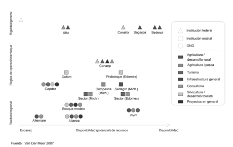 Como se muestra en la figura ii,[16] son muchas las instituciones y organizaciones; además estaban implementando una gran variedad de programas[17] con la finalidad de promover la aceptación de la reserva por parte de la población local. En esta figura también se señala que había diferencias considerables no sólo en cuanto al enfoque sectorial, sino también con respecto a las modalidades y reglas de operación, así como a los recursos financieros que tienen a su disposición los actores respectivos. En lo que concierne a las modalidades de operación, se pueden distinguir programas relativamente rígidos con una limitada flexibilidad operativa, comúnmente gestionados por instituciones federales que disponen de recursos considerables. Por otra parte, las instituciones estatales y las ong es frecuente que se caractericen por una mayor flexibilidad administrativa. Sin embargo, generalmente no tienen igual acceso a recursos financieros. Cabe destacar que también hay excepciones, por ejemplo, las instituciones estatales que reciben transferencias por parte del gobierno federal, o bien el World Wide Fund for Nature (wwf) que, al ser una prestigiosa ong internacional, está en condiciones de movilizar recursos notables.