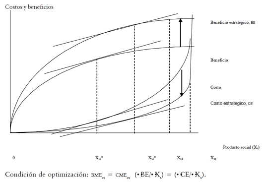Donde bmecs es el beneficio marginal estratégico de una unidad adicional de producto social, cmecs es el costo marginal estratégico de una unidad adicional de producto social y producto social es el resultado en términos de mejora social producido por el gasto en rsc.