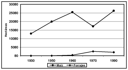 Superficie de maíz y forrajes de 1930 a 1990