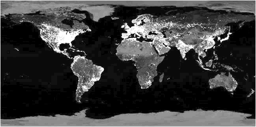 La figura ii, de la nasa, que muestra el mundo iluminado en agosto del 2002, es ampliamente conocida. Esta imagen es de un realismo impresionante: se observan todos los contornos de los continentes sin divisiones político-administrativas, y se concentra sólo en la iluminación nocturna del mundo. Ese realismo extremo es en verdad una pura representación, manipulada en todos los detalles. Ese mundo no existe.