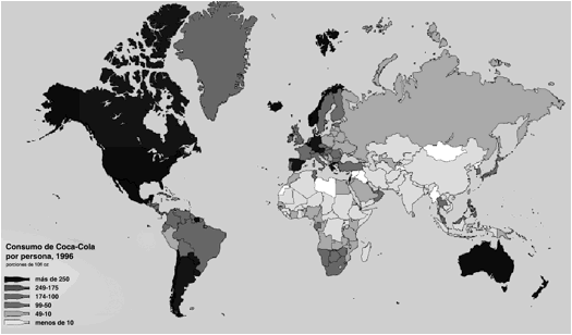 Como en otros casos de construcción de representaciones de una realidad, ella permite importantes inferencias: relacionar la densidad poblacional, la tasa de urbanización y la riqueza de regiones con mayor concentración de iluminación nocturna. Pero es simplemente una representación. Así como en la figura iii, donde vemos la relación directa entre el consumo de Coca-Cola por habitante como un indicador de riqueza de las naciones.