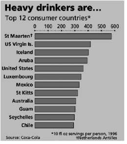 Ese cruce de datos, principalmente con la intención expresa en los gráficos y en el mapa (de que hay una relación directa entre la riqueza de las naciones y el consumo de Coca-Cola), genera inferencias asombrosas. Por ejemplo, cuando vemos que las islas de Saint Maarteen, Islas Vírgenes y Aruba tienen un altísimo consumo de gaseosa. Si la relación fuese de hecho de riqueza per cápita con el consumo per cápita de Coca-Cola, la conclusión es que las poblaciones ricas y saciadas de gaseosa, viven en paraísos tropicales. Éste no es el caso. Las tres islas tienen un flujo considerable de turistas, mucho más grande que la población residente –en Saint Maarteen, por ejemplo, hay 475 mil turistas por año para una población de 32 mil personas (unwto, 2005)–, y el turismo es responsable de gran parte del pib; y en Aruba, en 78% (wttc, 2006). Cuando la cantidad de gaseosa consumida por esos turistas se divide entre la población residente, llegamos a esos altos valores de consumo per cápita, lo que colocaría la isla Saint Maarteen entre los países con la población más rica del mundo.