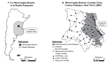 En la parte empírica de esta investigación se utilizan datos de origen censal suficientemente desagregados como para distinguir las áreas próximas de las distantes de una gran ciudad y su conurbano. Con un enfoque de estudio de caso, en este artículo se aborda el problema de la distribución espacial de los empleos rural no agrario y agrario no rural en una escala microrregional. El caso estudiado es el de la Microrregión Rosario, situada en el sur de la provincia de Santa Fe, en el núcleo agroexportador de la región pampeana argentina, la cual combina una intensa actividad agrícola con la existencia de un gran aglomerado urbano y una red de ciudades pequeñas y pueblos que cubre todo el territorio. La elección como estudio de caso responde a que esa combinación facilita la puesta a prueba de las hipótesis propuestas a continuación.
