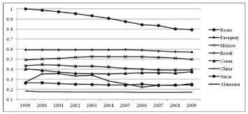 Al considerar la evolución temporal de lo territorial en la producción de los contenidos nacionales es importante averiguar si los altos niveles de polarización presentados en los inicios de la web se caracterizaron por una creciente redistribución a favor de las entidades no centrales. Este último supuesto se presenta como propicio a las entidades periféricas y se presta a una construcción relacionada con el comportamiento productivo en países desarrollados y emergentes que, por cierto, corresponde aclarar.