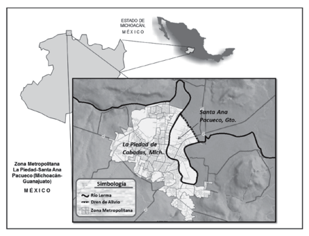 La Piedad de Cabadas, Michoacán, y Santa Ana Pacueco en Pénjamo, Guanajuato, son localidades colindantes separadas de manera natural por el lecho del río Lerma (figura i). Recientemente, estas dos localidades formaron la zona metropolitana La Piedad-Santa Ana Pacueco para promover un desarrollo conjunto y atender problemas comunes.