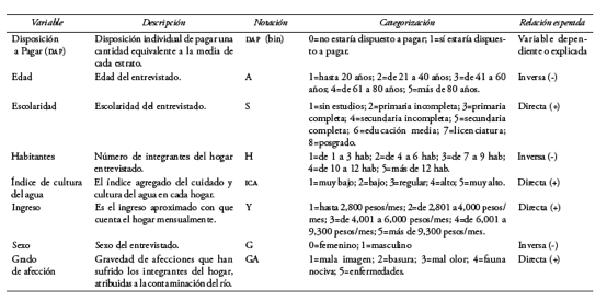 El mvc se sustenta en la llamada teoría de la utilidad aleatoria, la cual sostiene que la utilidad que un consumidor obtiene puede ser estimada mediante los componentes aleatorios o contingentes que manifiestan los individuos.[8] Para conocer cuáles son las variables que determinan la aceptación o rechazo del pago por mejoras ambientales en cada estrato realizamos varios análisis de correlación y regresiones logarítmicas sugeridos para este tipo de estudios (Pucutay-Vásquez, 2002; Riera et al. 2005; Labandeira et al., 2007). De esta manera, obtuvimos seis variables que explican la probabilidad de dap.