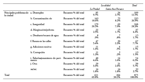 De acuerdo con los resultados obtenidos a partir del estudio a hogares, para los habitantes de esta zm la contaminación del río es uno de los principales problemas que enfrentan, es superado solamente por la inseguridad, pero considerada más grave aún que el desempleo, la falta de limpieza en las calles, la falta de pavimentación e incluso que la marginación o la pobreza (cuadro 3). Obsérvese el comportamiento similar y proporcional en las respuestas de ambas localidades.