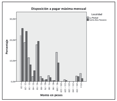 Siguiendo a Riera et al. (2005), la pregunta sobre el monto de dap por cada hogar se realizó en formato abierto, esto es, a partir de una cantidad inicial de cinco pesos/mes, el entrevistado expresa una cantidad que para él resulta adecuada, dados su nivel de ingreso, su situación de egresos, y el beneficio que espera recibir a cambio.