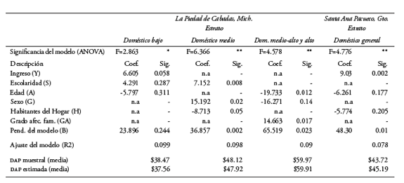 Es importante señalar que estos resultados aportaron evidencia a favor de la hipótesis de que los estratos socioeconómicos en que se dividió a la población de la zm La Piedad-Santa Ana Pacueco, se comportan de forma independiente, con determinantes de la dap y, por tanto, valoraciones diferentes a un nivel estadísticamente significativo.