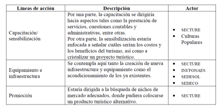 De lo anterior se desprende que la estructuración de una política turística que involucre a las comunidades estudiadas debería contemplar, entre otros componentes, las siguientes líneas de acción: i) capacitación/sensibilización; ii) fomento a la creación y habilitación de infraestructura y equipamiento; y, iii) promoción de un producto turístico alternativo (véase el cuadro 1).