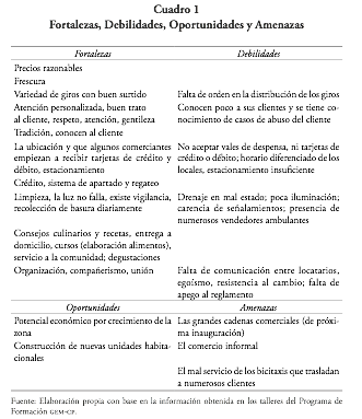 Una presentación esquemática de los principales resultados alcanzados en el total de las sesiones dedicadas al foda, se puede observar en el cuadro 1, el cual contiene las Fortalezas y Debilidades, así como las Oportunidades y Amenazas que mencionaron los comerciantes y que, sirvieron de base para planear acciones a futuro. Respecto al cuadro: las filas siguen el mismo orden de las variables que determinan la competitividad, las cuales aparecen enlistadas en el punto anterior. Ordenamiento que sirvió para soportar los planes de acción y la organización de los contenidos de la formación. Destacando, por último, que la redacción del cuadro respeta los textos redactados conjuntamente con los locatarios.