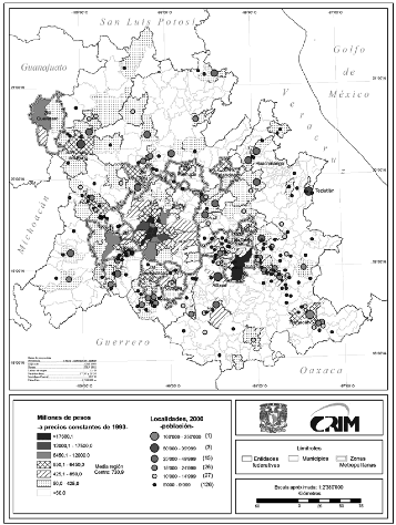 [8] Si se considera solamente el rango uno al que pertenecen seis municipios, la concentración del sector es aún más evidente, dado que en ellos se generó 56% del pib terciario en 1993.