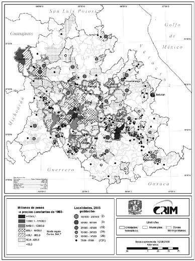 [7] Estos 12 municipios corresponden a los comprendidos en los dos primeros rangos de la clasificación de municipios de acuerdo al pib que aportan al sector primario. De ellos, nueve aportan un pib que va de 430,000 a 2.1 millones de pesos de 1993 (rango uno), y tres aportan un pib de 295,000 a 430,000 pesos (rango dos). En total, se obtuvieron siete rangos que se aprecian en el cuadro 1.