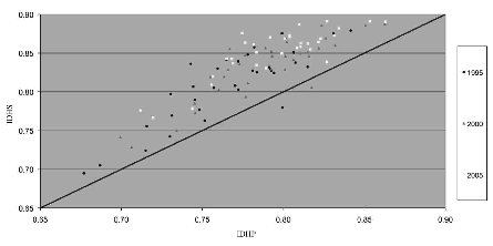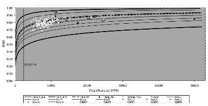 Para estimar el idh, que aquí llamamos índice de desarrollo humano con producto interno bruto (idhp), se emplean las variables siguientes: esperanza de vida (ev), tasa de alfabetización, tasa de niños de seis a 14 años que saben leer y escribir, y producto interno bruto per cápita (pibp). Esta combinación de variables muestra que el crecimiento económico es necesario mas no suficiente para mejorar el bienestar de una población. Se presenta el índice de desarrollo humano con servicios (idhs) como una alternativa al idho, sustituyendo la información relativa al pibp por la de los servicios de agua entubada, drenaje y electricidad asociados con sus correspondientes indicadores: Inagu, Indre e Inele. Las diferencias de género y los avances que se tienen en este aspecto son cuestiones que no refleja el idhp, ya que éste le asigna a cada individuo de una población el logro promedio alcanzado en cada una de las variables que lo conforman. Ante esta situación, Anand y Sen (1995) propusieron la construcción del índice de desarrollo humano relativo al género (dhg), el cual utiliza las mismas variables que el idhp pero incorpora la desigualdad entre hombres y mujeres. El idg se desarrolló para mostrar que ninguna sociedad trata de igual manera a las mujeres y a los hombres, y que la igualdad de género no depende del nivel de ingreso de una sociedad (De la Cruz, 2007). La inequidad que se observa en el dh es otro factor a tomar en cuenta cuando se habla del bienestar de las personas. Para medir la variación en la distribución del desarrollo en una entidad se construyó un índice de inequidad (Inq) para cada variable de interés, las cuales exhibirán la distribución o carencia de la misma de los componentes principales del dh. Por último se analiza la calidad municipal mediante la construcción de curvas de calidad, herramienta de análisis propuesta por Zamudio et al. (2001). Expresa la eficiencia en la transformación del ingreso en mejores condiciones de salud, educación y servicios básicos. Este análisis facilita la comparación de dh entre dos territorios con un mismo ingreso o la comparación de ingresos entre dos territorios con el mismo dh.