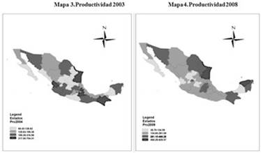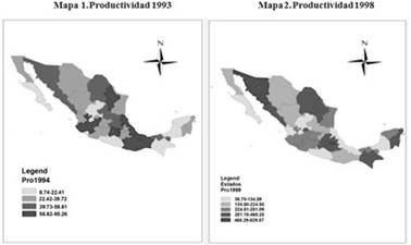 Los mapas reflejan en el color más claro bajos niveles de productividad, mientras que la mayor productividad se muestra en el tono más oscuro. En breve resumen, para 1993, las entidades más productivas resultaron ser Distrito Federal, Estado de México, Jalisco y Nuevo León, mientras que los menos productivos fueron Guerrero, Campeche, Chiapas, Yucatán y Zacatecas. En 1998 hubo algunos cambios en los niveles de productividad en las entidades, pero en general se mantuvo la misma tendencia en cuanto a los más y los menos productivos; para el 2003, el patrón cambió drásticamente, ya que entidades como Nuevo León