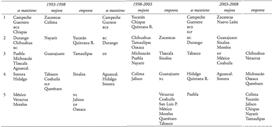 Para el cuarto intervalo se tiene que Hidalgo y Querétaro se mantuvieron, Aguascalientes y Sonora mejoraron mientras que Michoacán, Querétaro y Oaxaca empeoraron. En lo que respecta al quinto rango, se tiene que sólo Puebla mantuvo su posición; en cambio Colima, Chiapas, Jalisco, Nayarit, Tamaulipas y Yucatán la empeoraron.