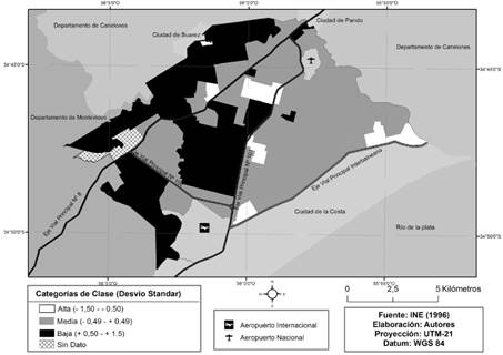 Posteriormente, se procedió a realización del índice de estratificación socioeconómica en función de las carencias básicas que presenta la población para este conjunto de variables. En este sentido, se le asignó mayor valor a: i) los niveles más bajos de educación; ii) si los materiales constitutivos de la vivienda están basados en elementos precarios; iii) si existe ausencia de los elementos de confort, y iv) si la condición de la actividad económica es desfavorable (trabajo). Finalmente, para poder visualizar de forma más clara los resultados, se elaboraron tres categorías cualitativas (bajas, medias y altas), con base en la desviación estándar.